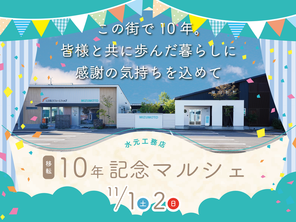 さて、今回は皆様と共に歩んだ暮らしに感謝の気持ちを込めまして、「水元工務店 移転10年記念マルシェ」を開催いたします!