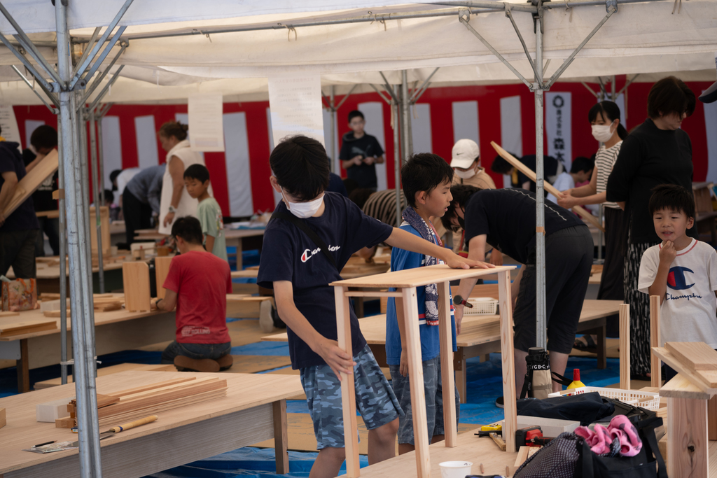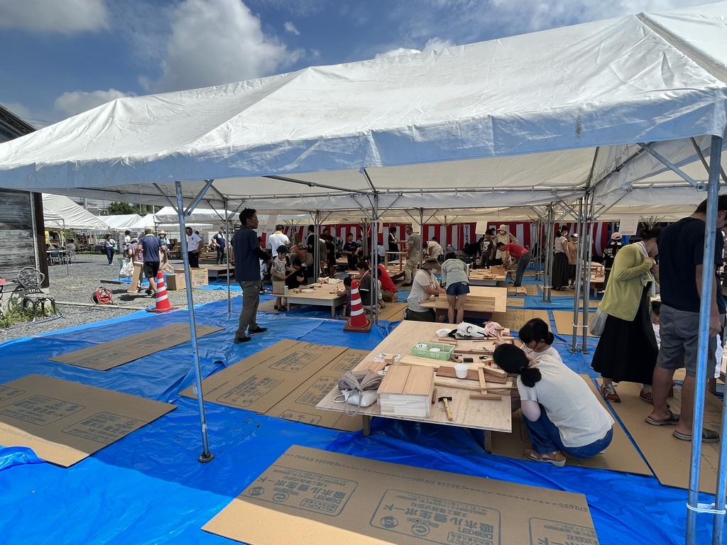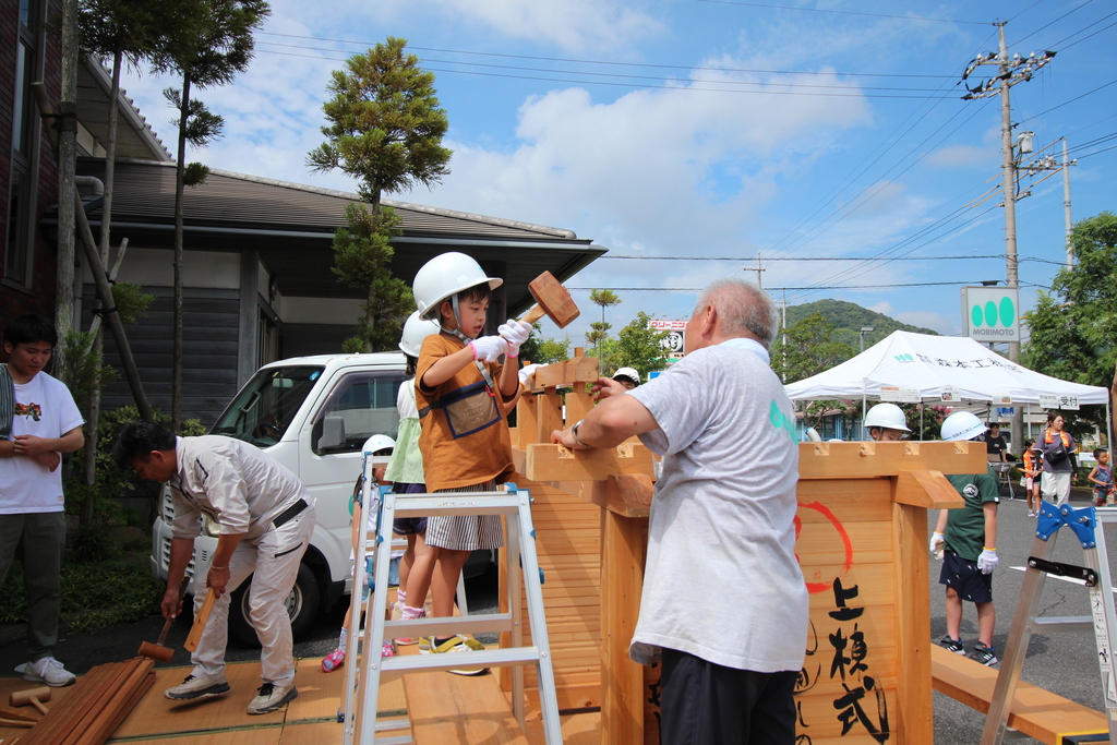 キッズ木工、射的、重機体験、ヒノキのボールプール、木の雑貨販売、瓦割り体験など、家族みんなで楽しめる企画がいっぱい!