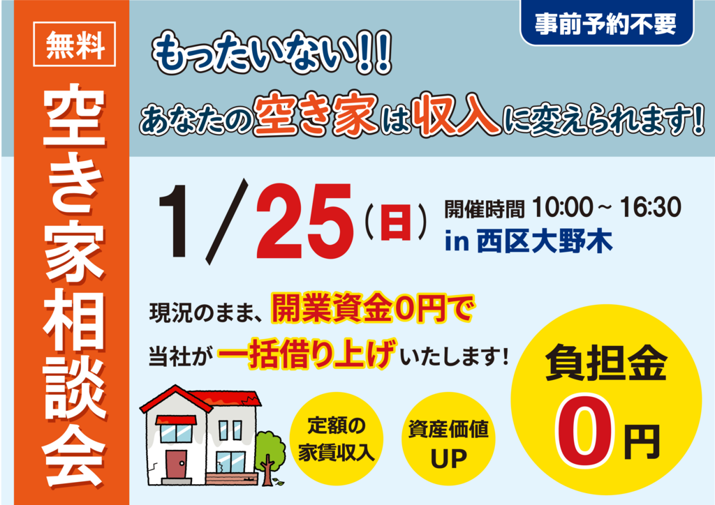 | タイトル | 【1/25西区】負担金0円で、空き家を活かす相談会【事前予約不要】 |