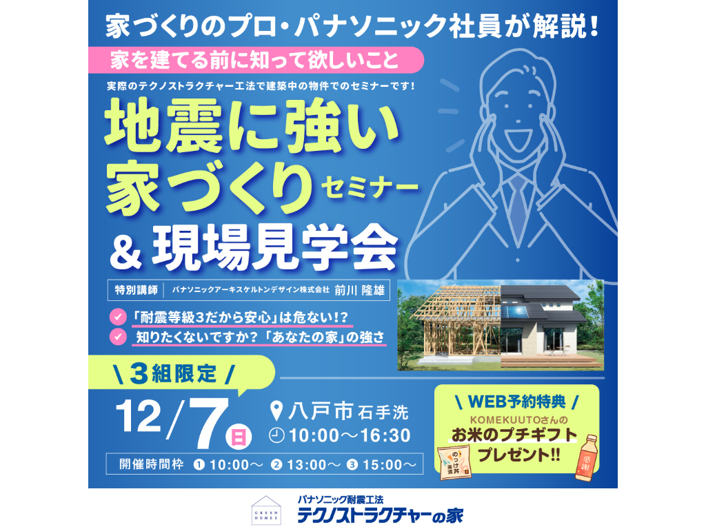 | タイトル | パナソニック社員が解説!地震に強い家づくりセミナー+現場見学会 |