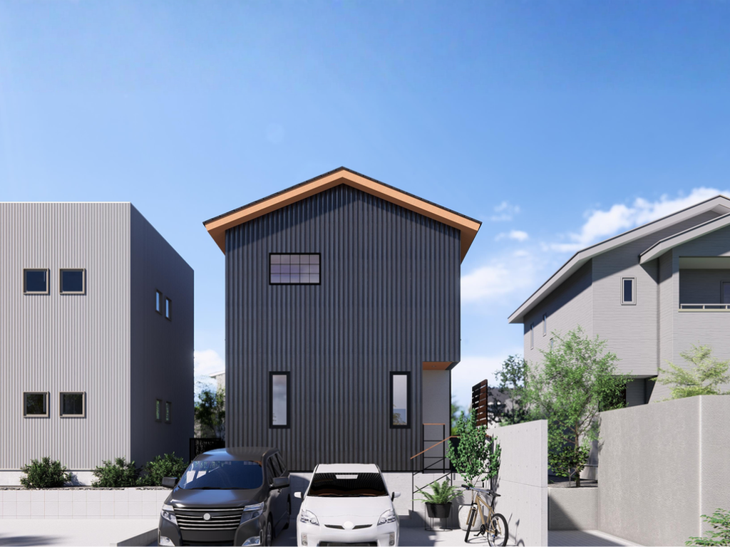 外観デザインのガルバの縦ラインが描く端正な立ち姿とシンプルな切妻屋根が落ち着きさを表現。
