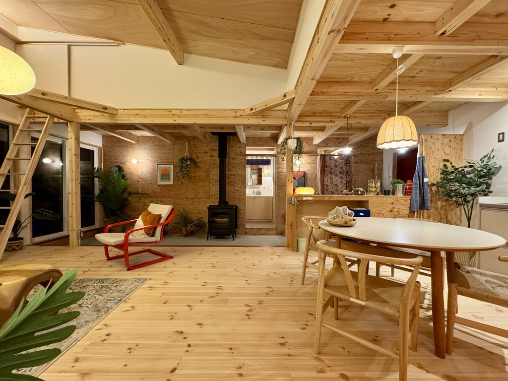 天井の高い開放的なリビングに、やさしく揺らめく炎。木の香りに包まれ、家族や友人と語らう時間が流れます。自然素材をふんだんに使った空間は、夏は涼しく冬は暖かい理想の住まい。