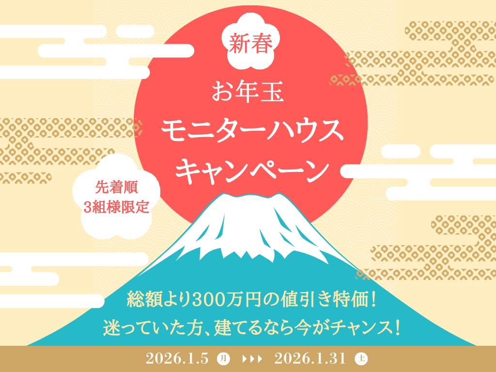 さて弊社では、1月5日(月)~ 1月31日(土)までの期間限定で、新春お年玉モニターハウスキャンペーンを開催します。
