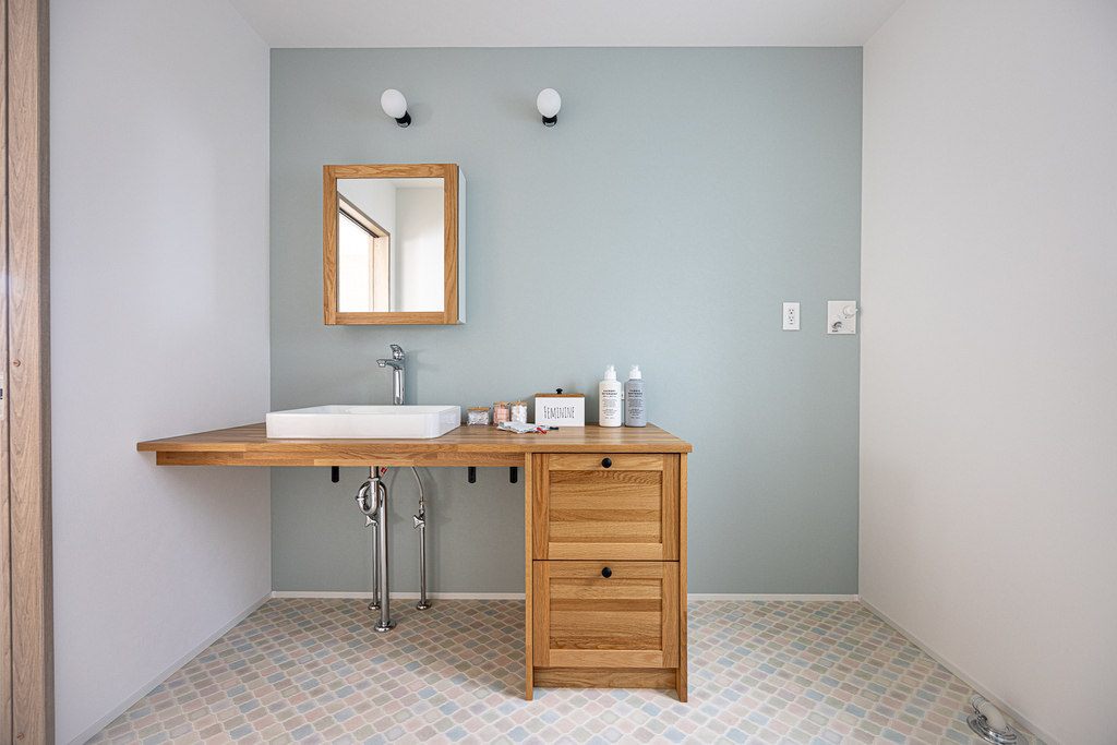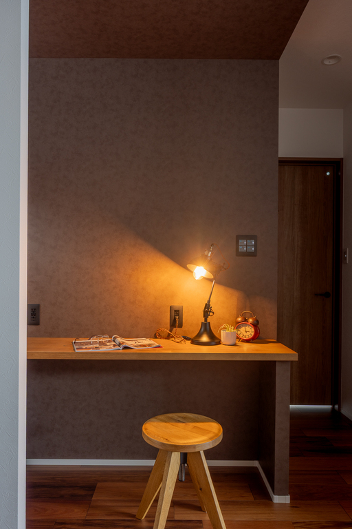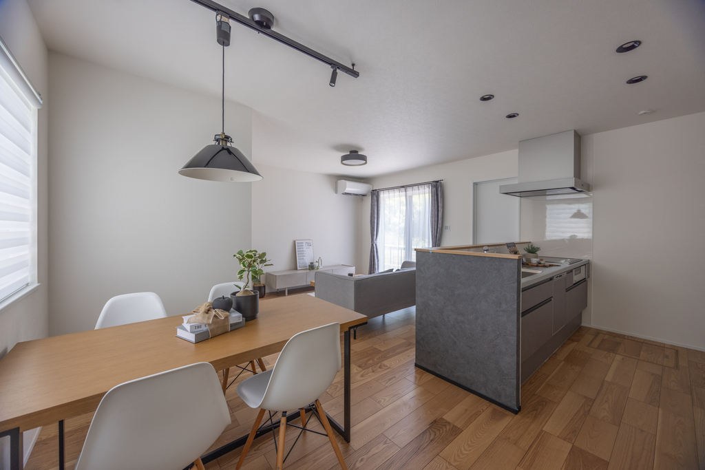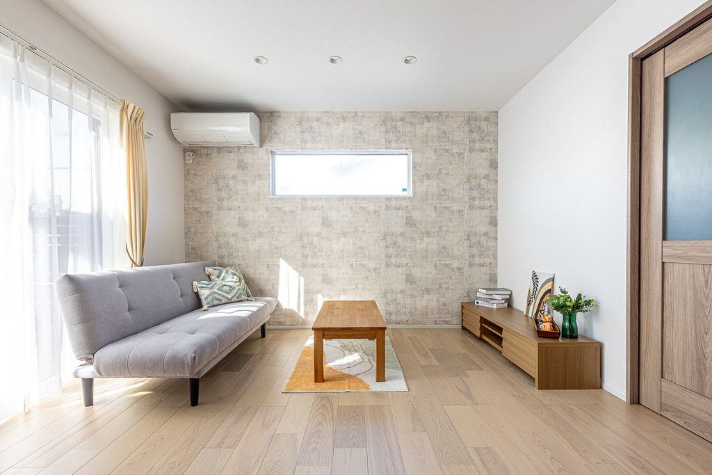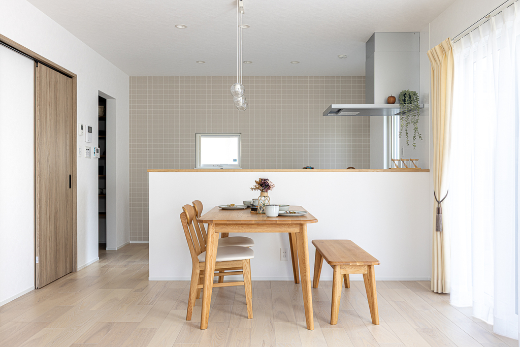 明るい木目とベージュを基調に仕上げた、やさしい雰囲気のモデルハウス。LDKはキッチン・ダイニング・リビングが一直線につながり、家族が自然と同じ時間を共有できる間取りです。アクセントに貼られた石目調クロスが空間に上品さを添え、ナチュラルな中にも洗練を感じる仕上がりに。