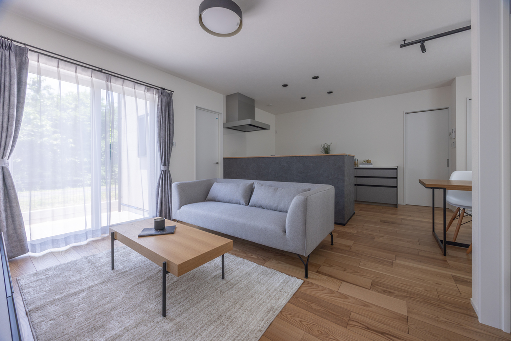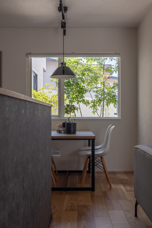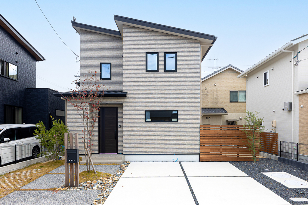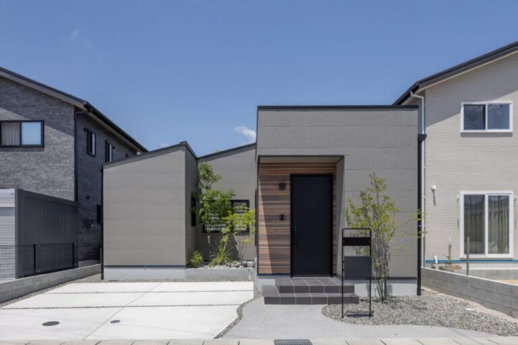 窓の外の緑を美しく切り取る配置計画が魅力の平屋モデルハウス。大きく光を取り込むのではなく、視線の先に季節の彩りがそっと寄り添うようにデザインされたLDKは、落ち着きと心地いい余白を感じる空間に。外観も植栽が映えるグレーのファサードで、街並みにすっと馴染む洗練された佇まい。
