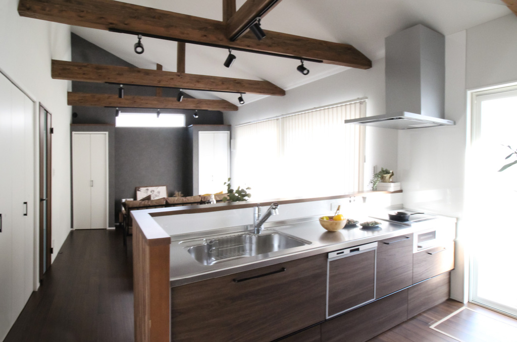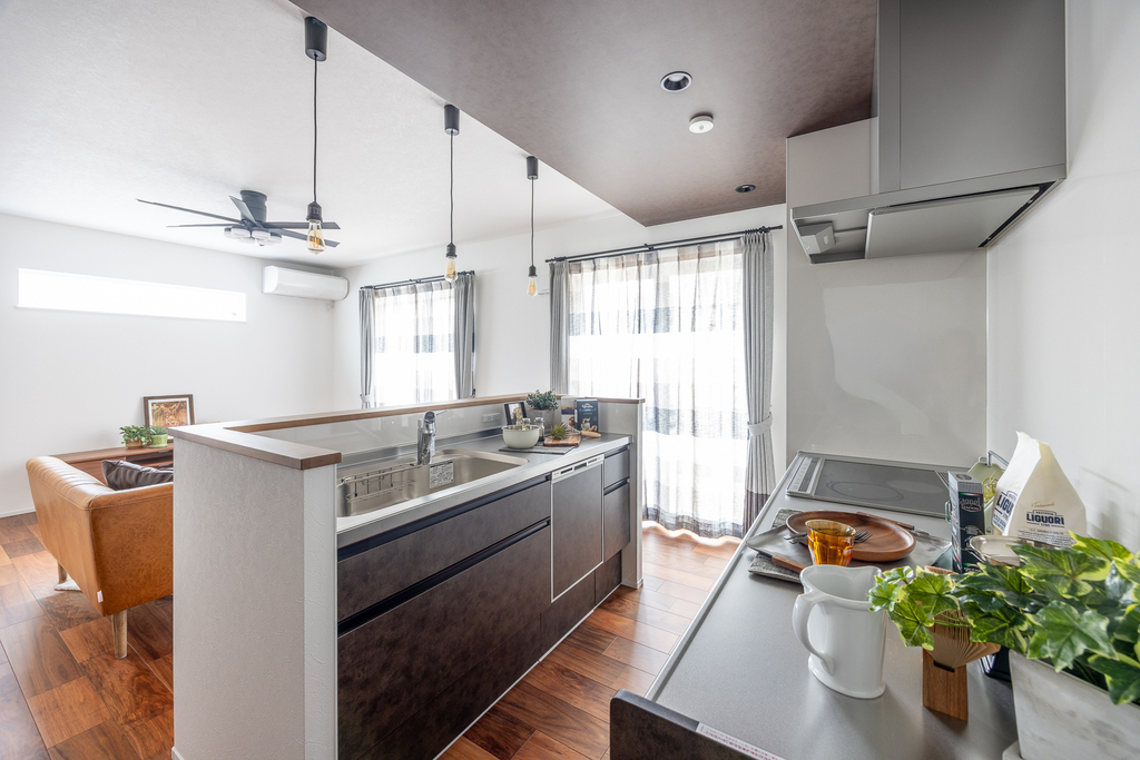 開放的な勾配天井にあらわし梁、ダークブラウンの床と木目のキッチンが調和した、落ち着きのある大人の平屋モデルハウス。LDKはキッチン・ダイニング・リビングが一直線につながる伸びやかな空間で、家族それぞれの時間を過ごしながらもしっかりつながれる間取りに。