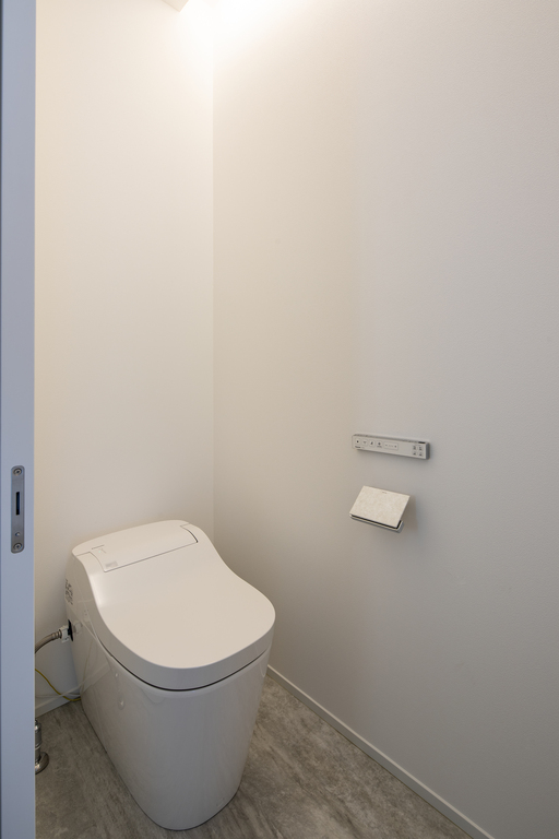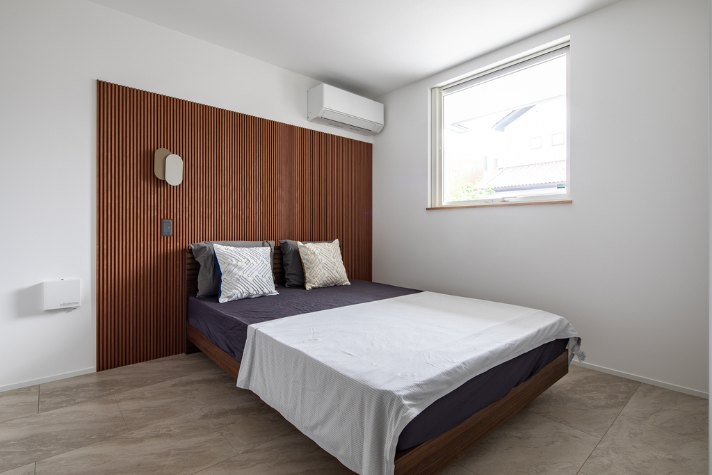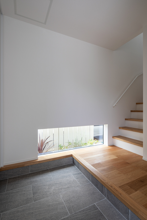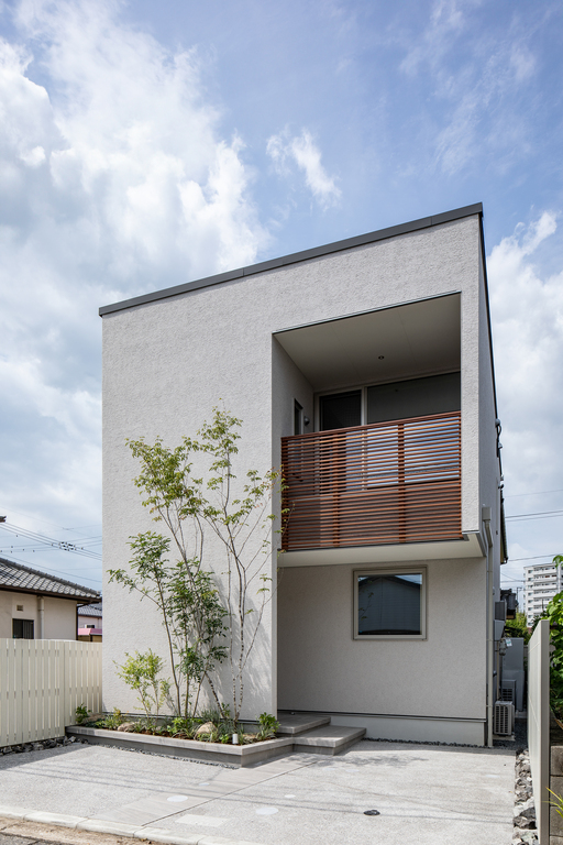 シンプルなファサードに天然木のルーバーが上品なアクセント。外からの視線をほどよく遮りながら、光と風を招く心地よさを実現しました。街並みに静かに調和しながら、確かな美意識が宿る一棟です。