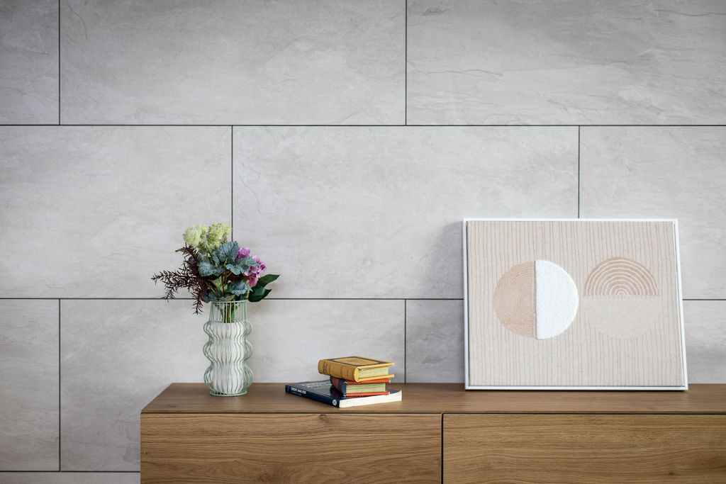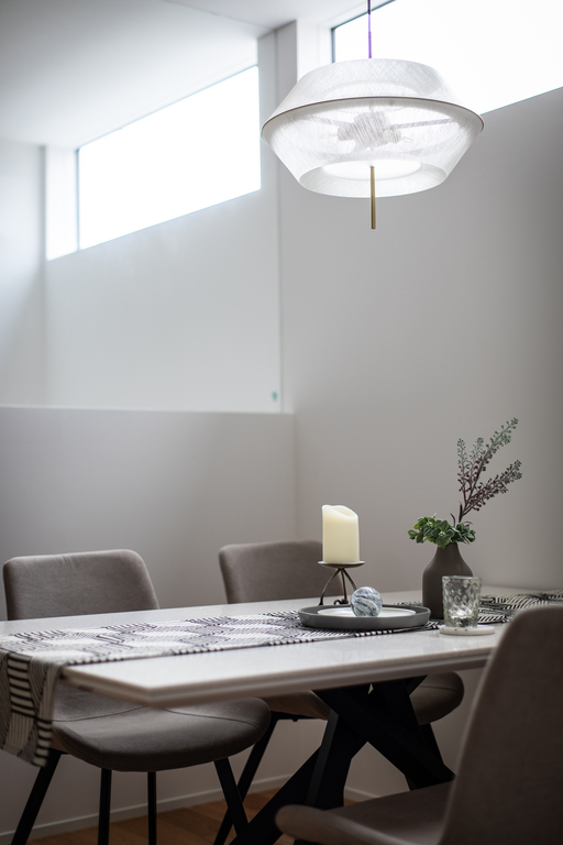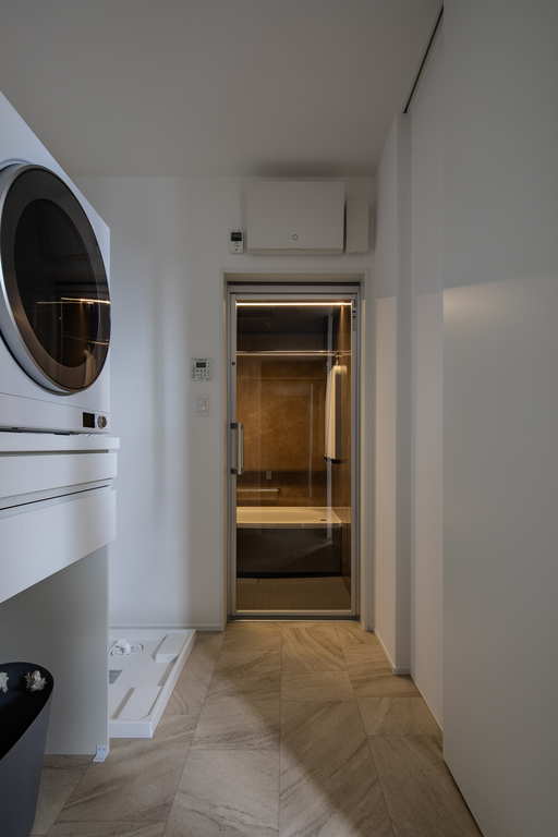 石目調のタイルと質感を抑えたキッチンが、静けさの中に凛とした存在感を放つダイニング空間。高窓や内窓から差し込む光が、時間とともに移ろう陰影を描き出し、空間に奥行きをもたらします。