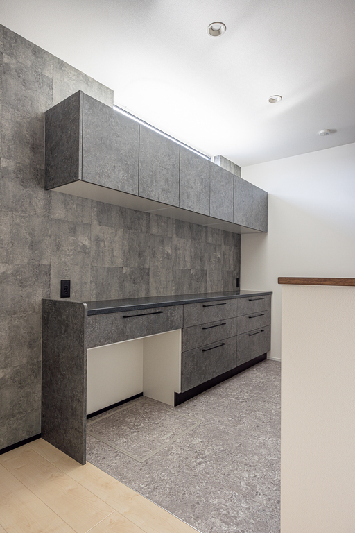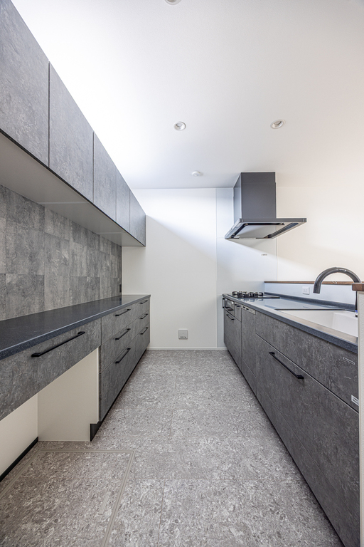落ち着いたグレーのキッチンに、明るい床と白い壁がほどよい抜け感をプラス。