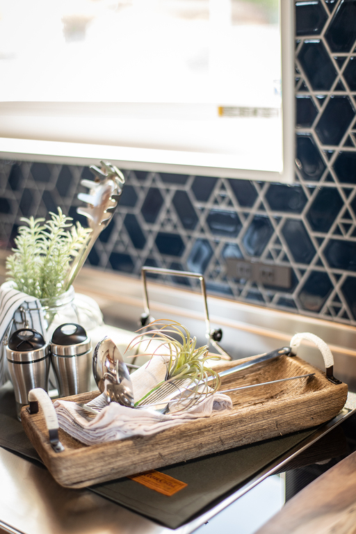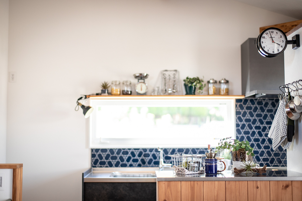 ブルーのタイルが目を引くおしゃれなキッチン。壁付けキッチンに対面の作業台を設けることで広く使うことが可能です。