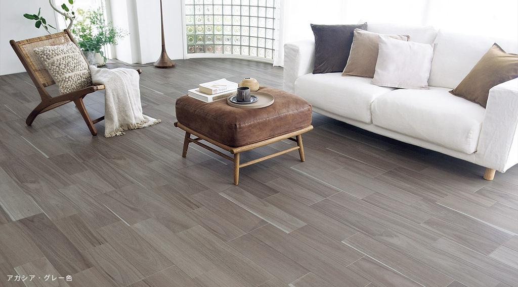 天然木の床材では珍しいグレートーンです。写真では伝わりにくい色味や質感を、ぜひご体感ください。