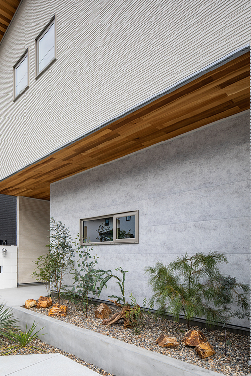 掃き出し窓の上に建物をオーバーハングさせることで、室内に入る強い日差しをやわらげるパッシブ設計に。