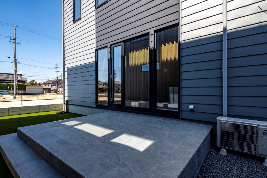 リビングから続くテラスは、屋内外をゆるやかにつなぎます。光と風を感じながらゆったり過ごせる空間です。