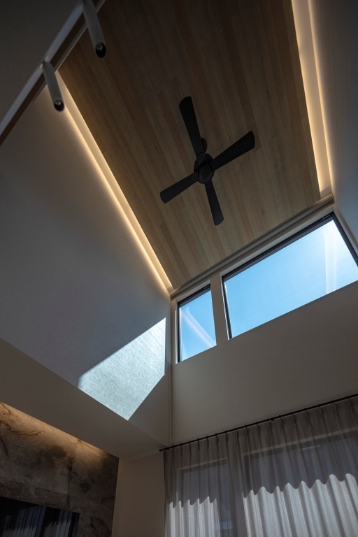 2つの窓から差し込む光が空間を包み込みます。天井を高く設計することで、より開放的で心地よい寝室に仕上げました。