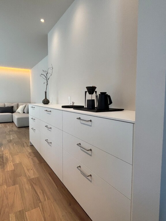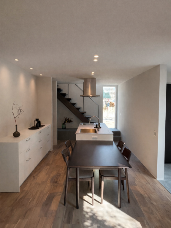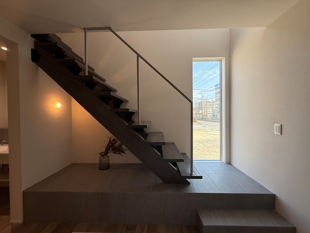 木とタイルのバランスを調整した、“冷たすぎず温かすぎない”絶妙な心地よさ。色数を抑え素材の質を活かして、静けさのある住まいを演出。玄関床・階段小上がり・洗面は同じタイル材で統一し、ミニマルなデザインに仕上げました。