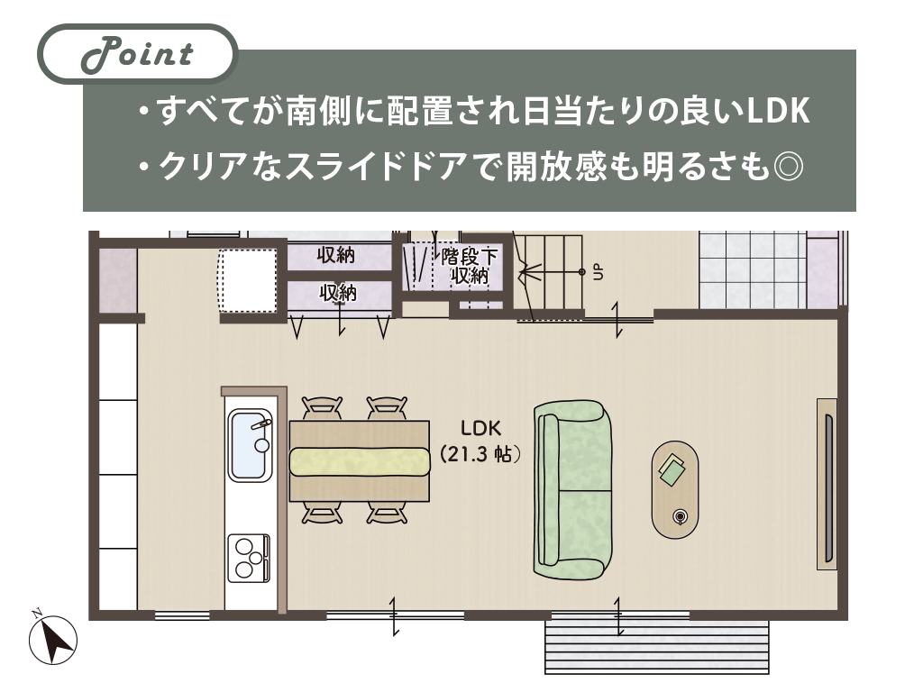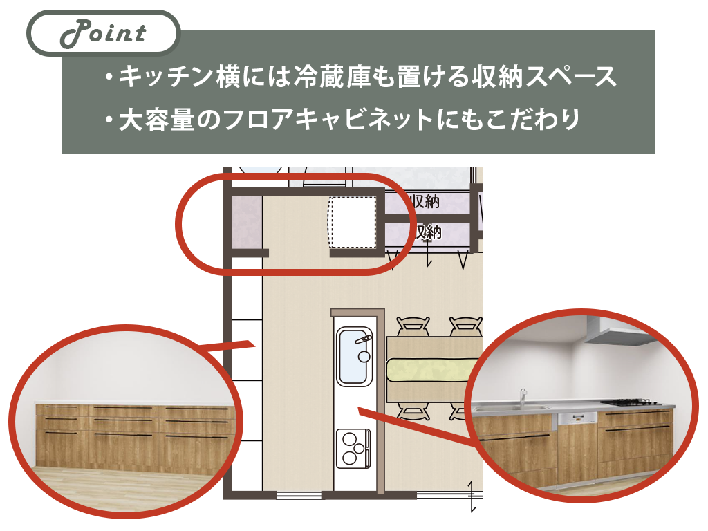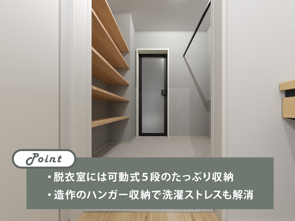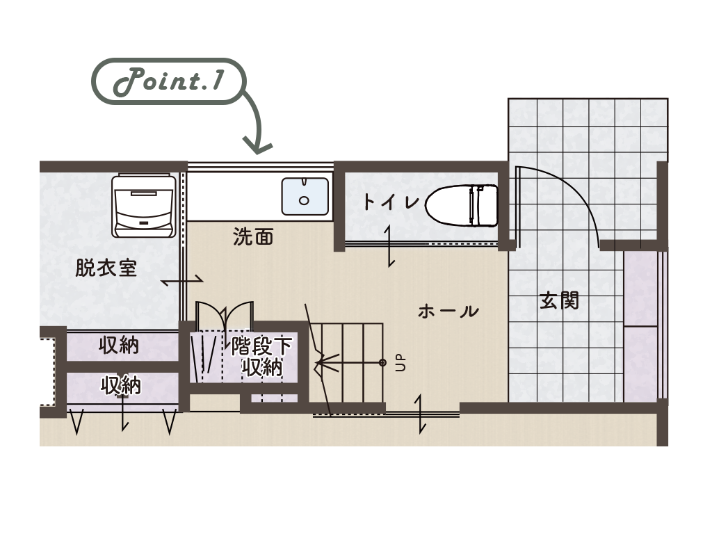 玄関からの動線に洗面を配置することで、リビングを通らなくても清潔に、そして身だしなみを整えることができます。