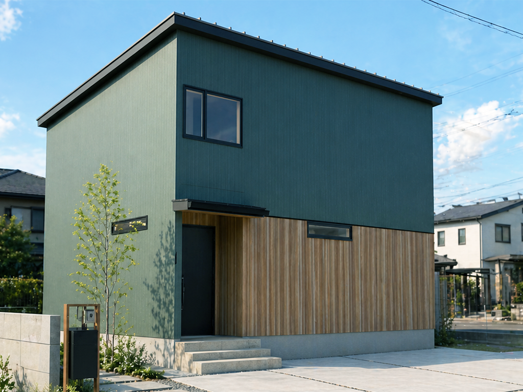 ガルバリウム鋼板×木調サイディングは一見、真逆な素材ですが、ガルバリウムのカラーをモスグリーンにすることで、どのアングルから見ても「モダン」と「温かみ」の調和がとれた外観に仕上がっています。