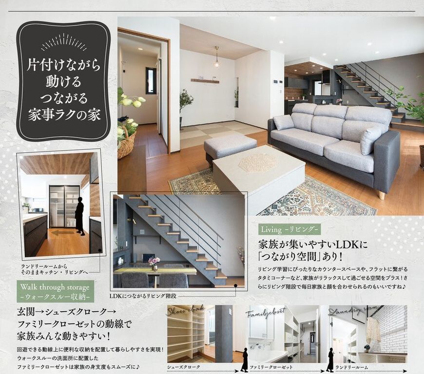 家事を楽にする動線設計が、このモデルハウスの最大の魅力です。家事にかかる時間を短縮することで、家族との大切な時間を増やすことができます。たっぷり収納スペースを確保しているため、片付けも楽々!ストレスフリーな生活を実現します。