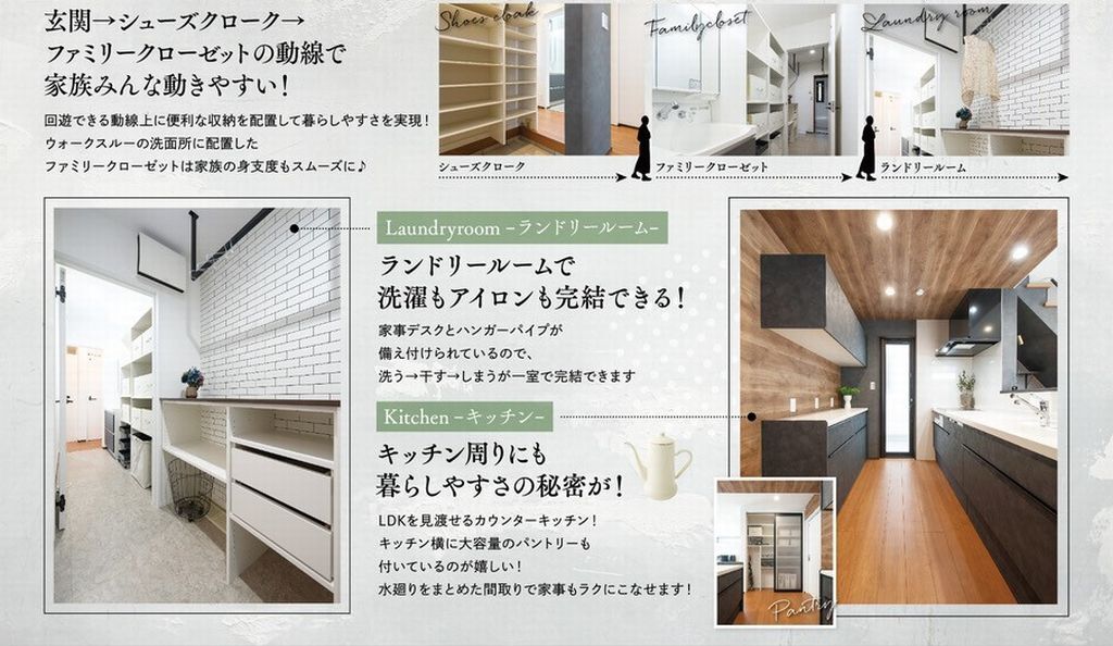 - シューズクローゼットからファミリークローゼット、そしてランドリールームへとつながる動線