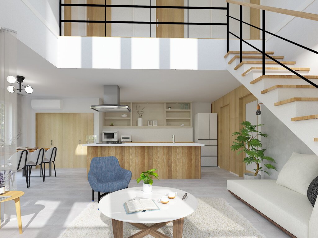 グレーを基調に木目の意匠を組み合わせ、開放感のある吹き抜けを活かしつつ、温かみのあるリラックス空間を演出しています。