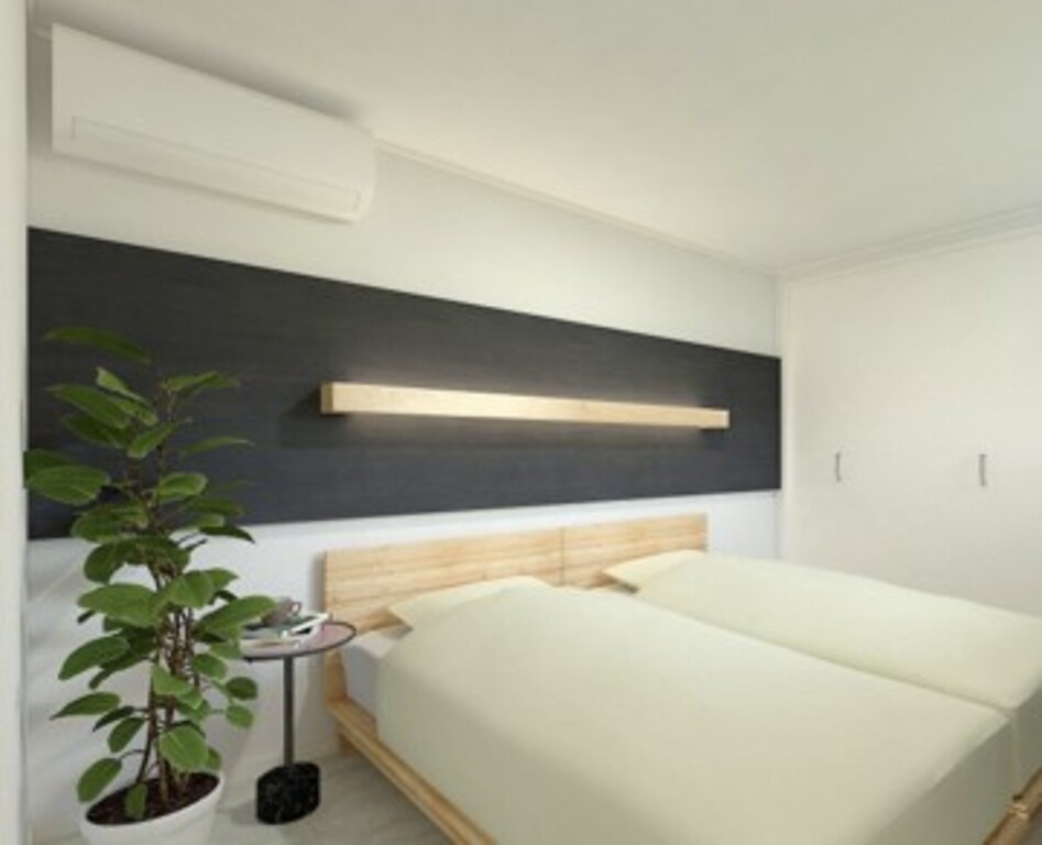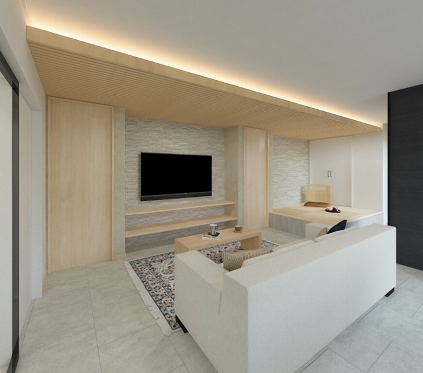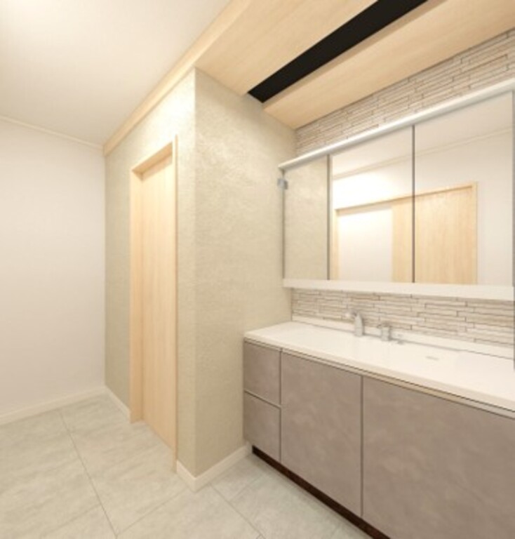 ユニット感をなくせるよう背面にタイル面材を用いました。また、横幅感の強調の為、天井に木貼りを設置し空間が広く感じられるよう工夫いたしました。