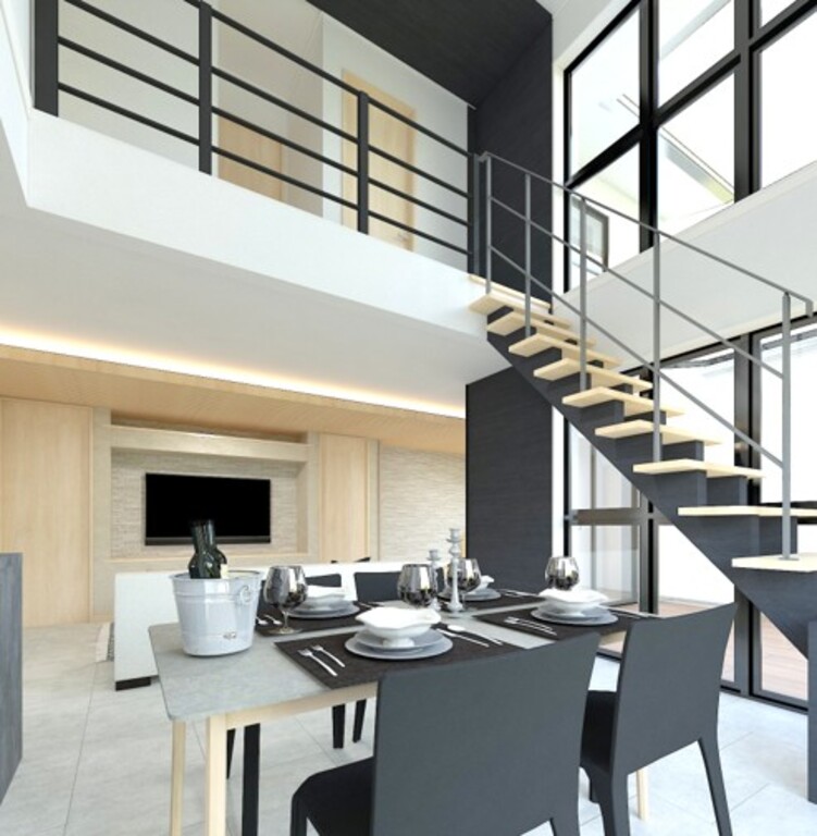 リビングは、高天井を強調し空間を締められるようなブラックの縦ラインを設置。