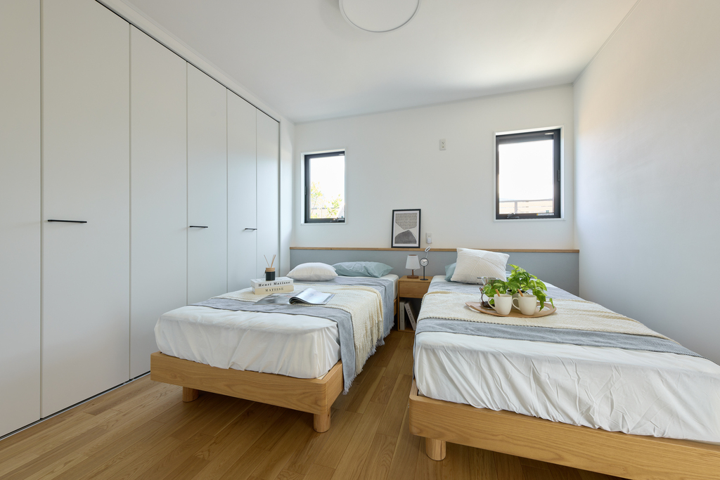 平屋感覚で生活できるように1階に寝室を配置。生活のほとんどが1階で完結できる設計で、水まわりにも近いので、家事動線がコンパクトに済みます。