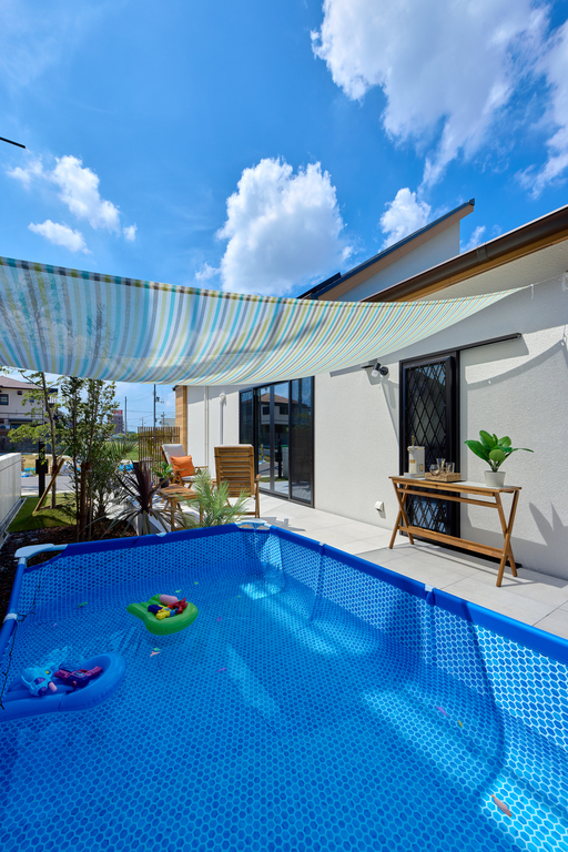 憧れのプライベートプール。掘り下げではないので、庭を広く使いたい場合は片づけて、広々としたタイルデッキとしても使える自由度の高い設計です。