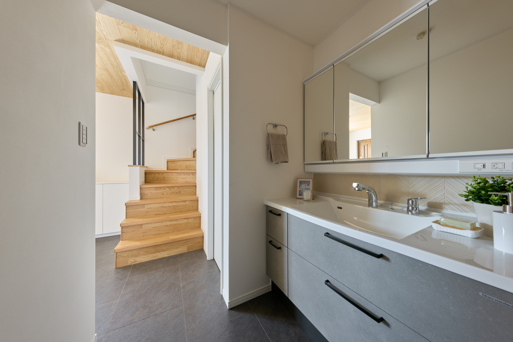 スライド扉で空間が仕切られているので、誰かがお風呂に入っていても気をつかわずに洗面所を使うことができます。