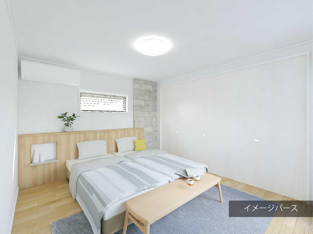 南向きバルコニーに面した明るい主寝室。壁一面に設けた大型クローゼットは収納力抜群。