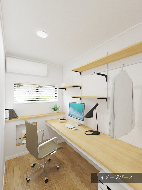 カウンターと造作棚を設けた2人並んで使えるワークスペースは、ファミリークロークや納戸、書斎としてもお使いいただけます。