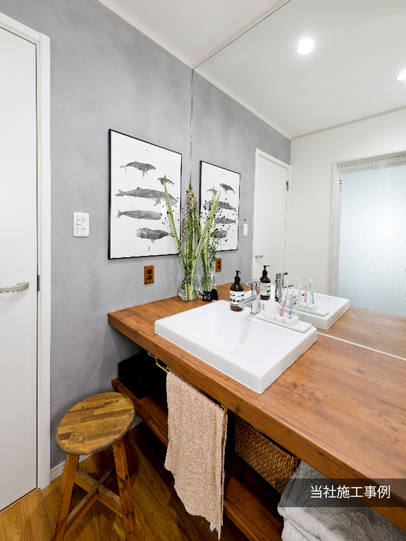 洗面室と脱衣室が仕切られているので、入浴中のご家族がいても気兼ねなく洗面室を使用できます。オープンクローゼットが設置されているので、洗濯物を干したり、室内着やリネン収納に便利。部屋干しの洗濯動線は完璧です。