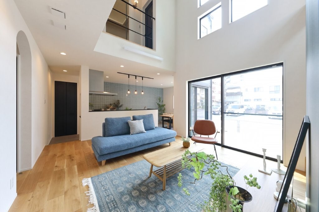 天井まで伸びる吹き抜けが、リビングに自然光と広がりをもたらします。