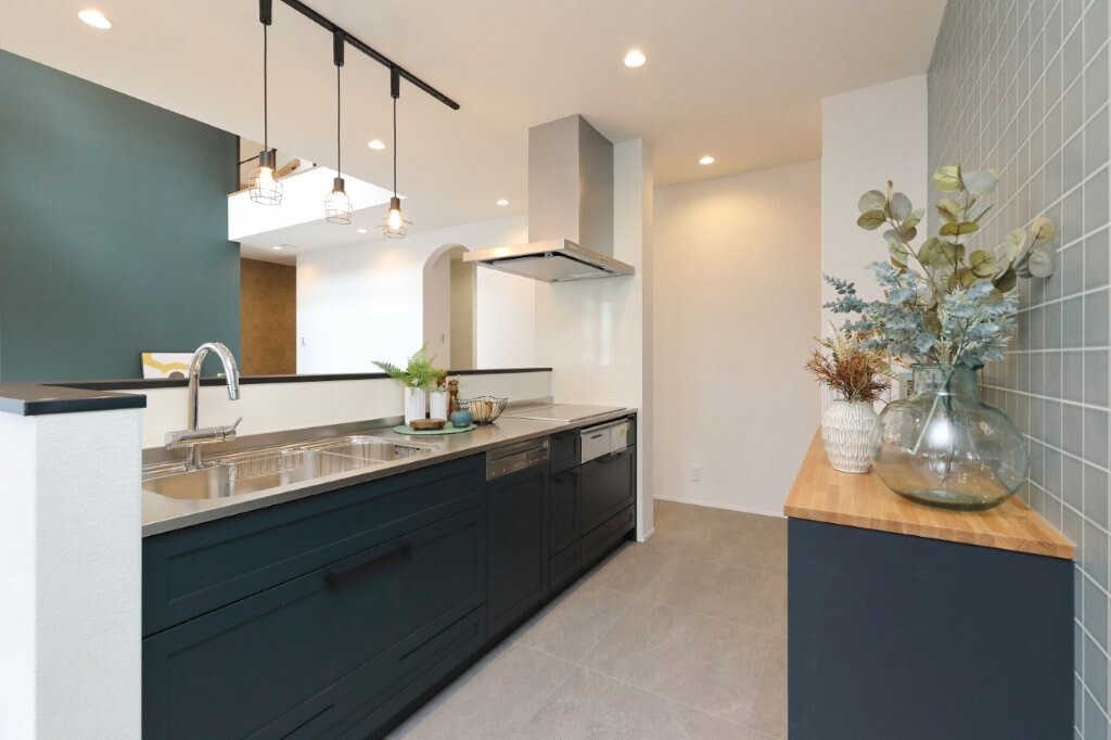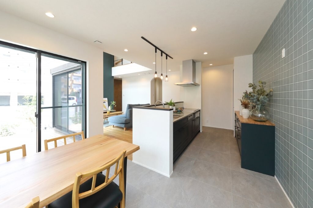 グリーン系のスクエアタイルが、空間をおしゃれに引き締めます。