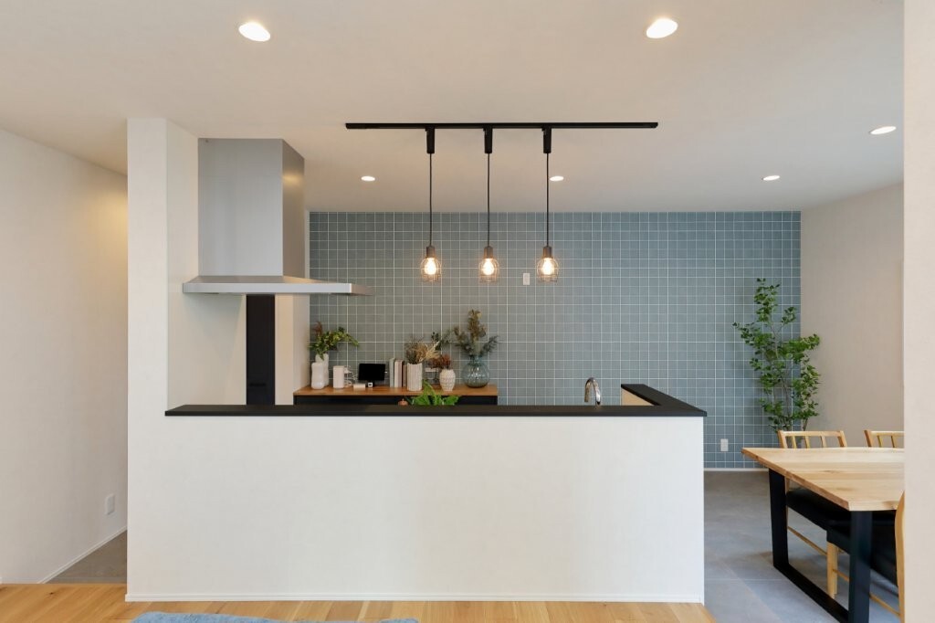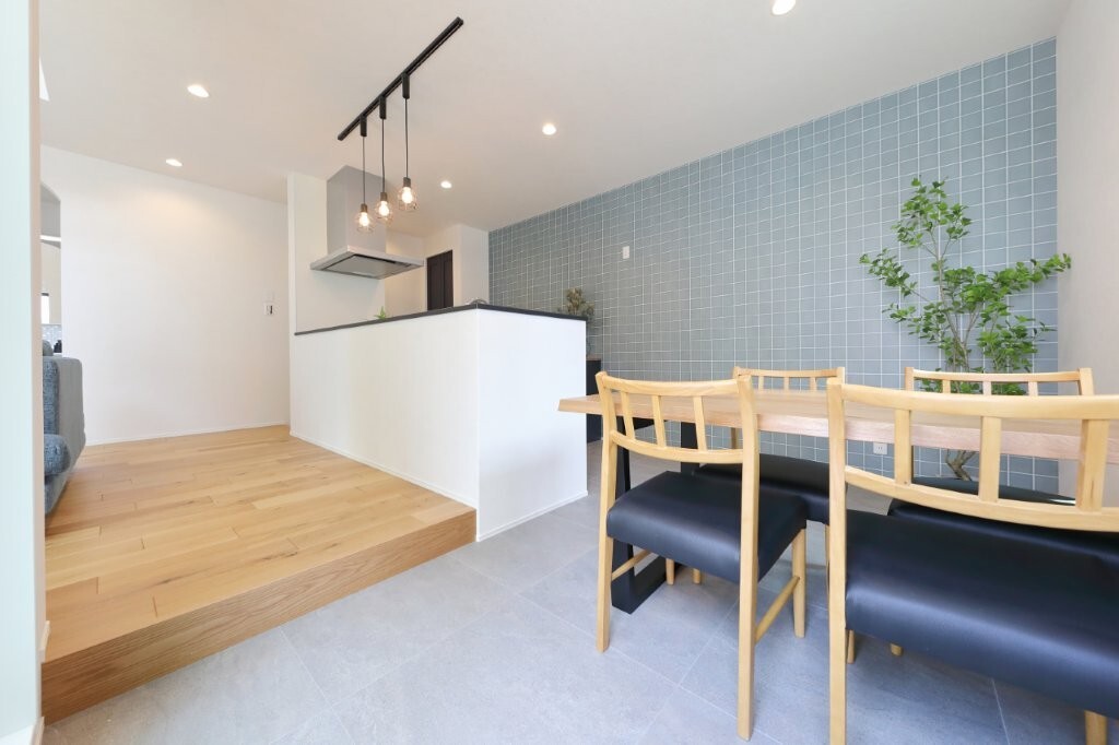 キッチンとダイニングの間に高さと差をつけることで、空間を自然にゾーニング。