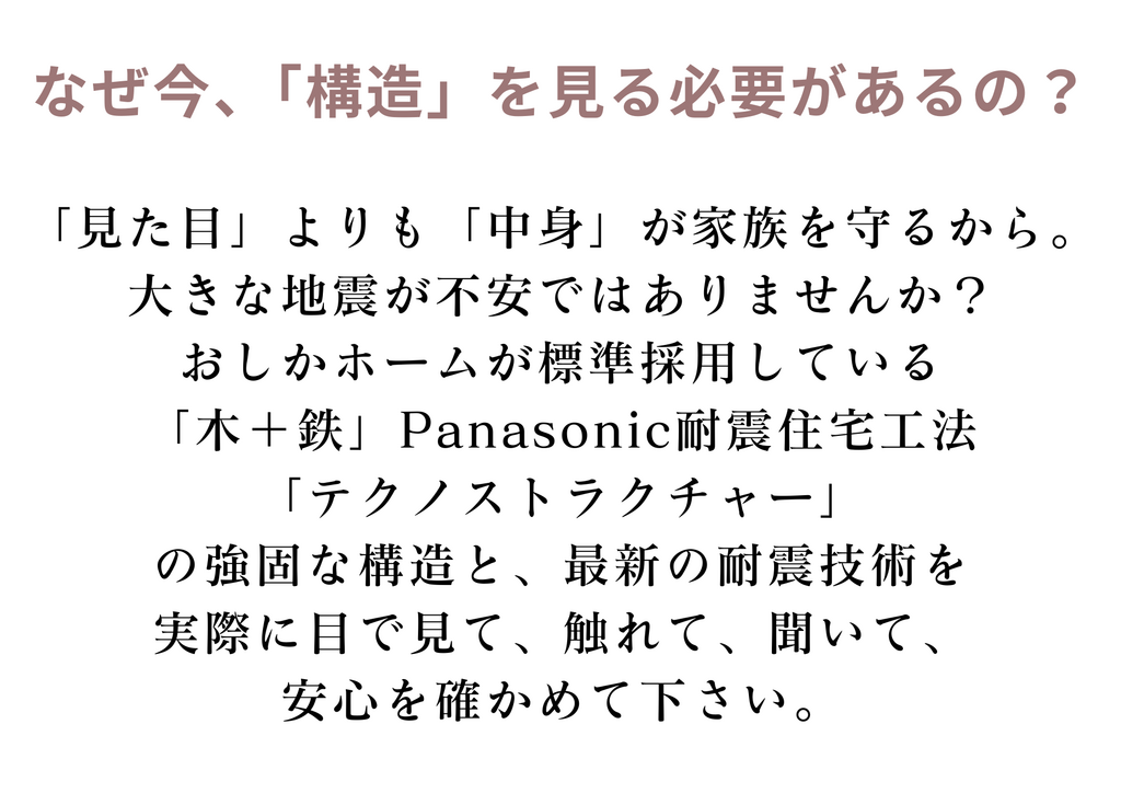 今回の構造見学会では、Panasonic耐震住宅工法「テクノストラクチャー」の地震に強い骨組みと、断熱性能を実際に確認いただけます。