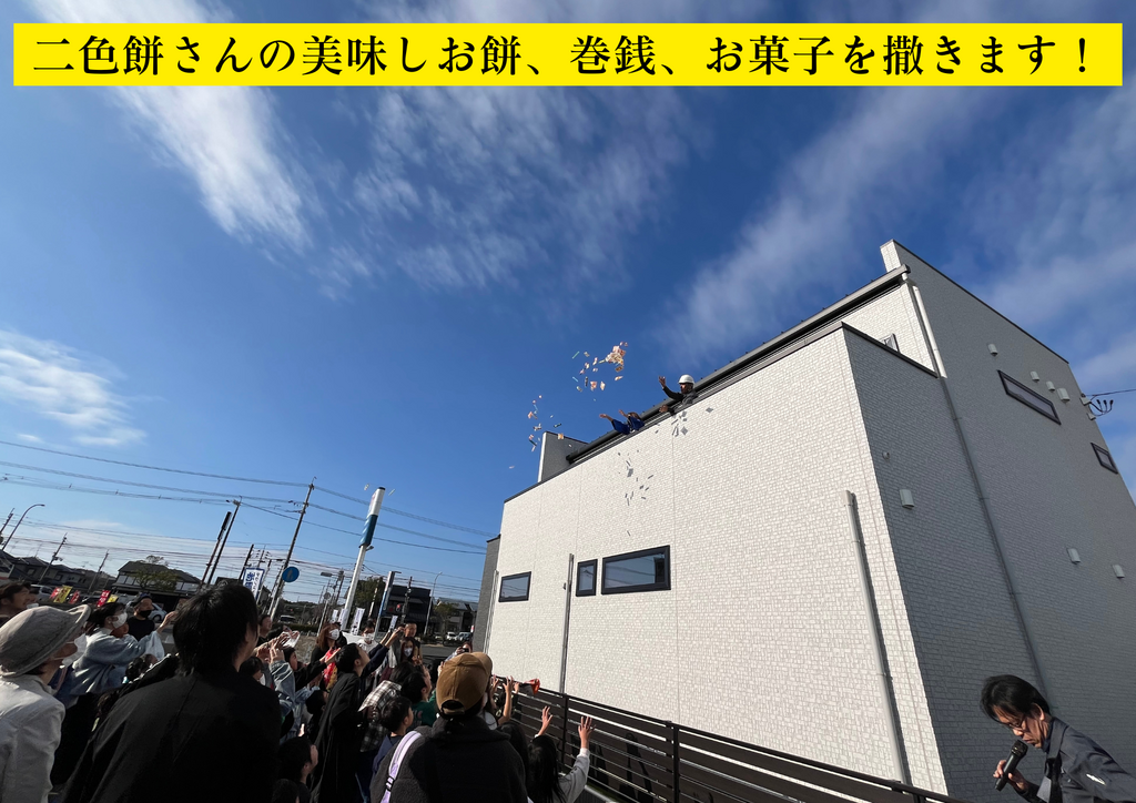 最近では見る機会が少なくなった上棟式の「もちまき」。お餅やお菓子を投げて、みんなで福を分かち合いましょう!