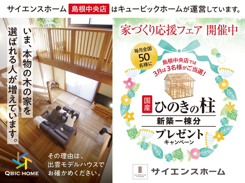 | タイトル | 【家づくり応援フェア】国産ひのきの柱「新築1棟分」プレゼントキャンペーン&モデルハウス体験会 |
