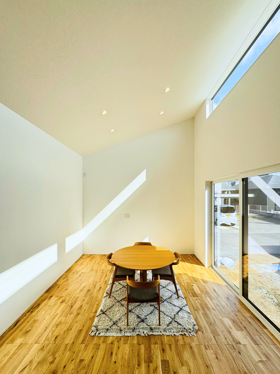 「だんちがいの平屋」は、異なる屋根勾配による段差を利用し、高窓(ハイサイドライト)からリビングの奥まで明るい日差しが届き、日中の室内を自然光で満たしてくれます。また、東側の駐車場に面した大きな窓を設け、お気に入りの車やバイクを眺めることができます。