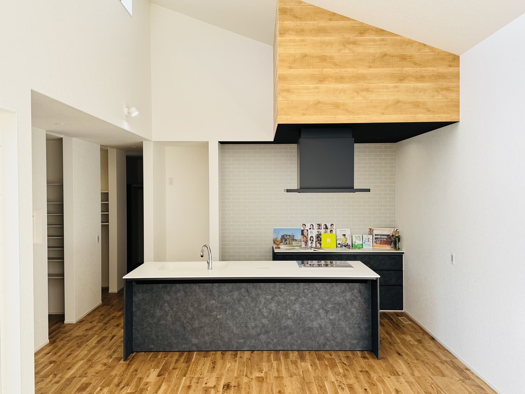 デザイン性と使い勝手を両立したキッチン。壁紙との相乗効果で、まるでお気に入りのカフェのような空間を演出します。アイランドキッチンを中心に、パントリーや外部収納、シューズクロークへとつながる2WAY動線で、家事効率も格段にアップします。