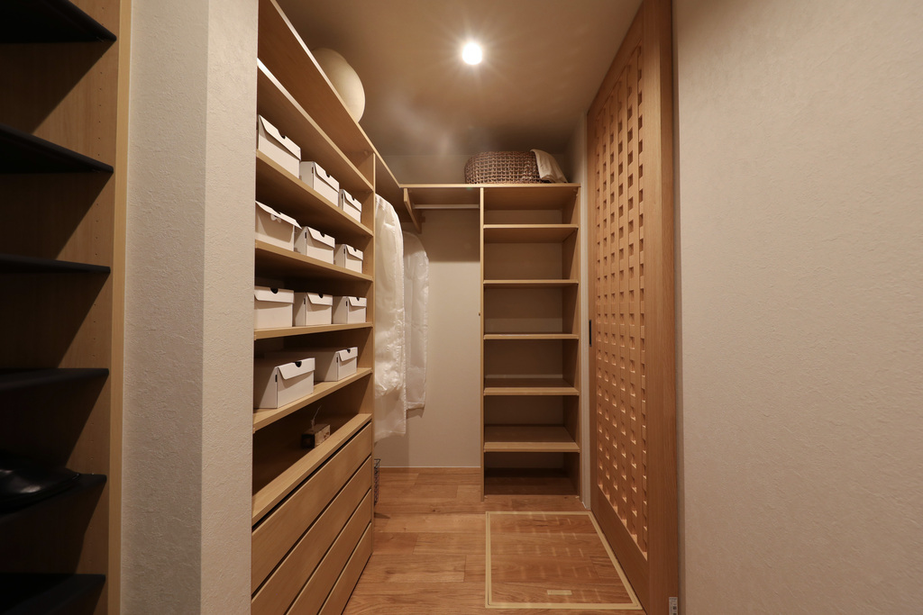 玄関からはファミリークロゼットへそのまま直行でき、さらにウォークスルーで脱衣所・ランドリールームへつながる設計。