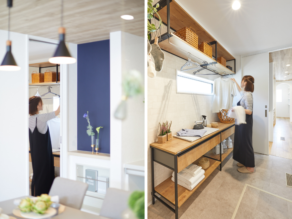 洗面室と脱衣所を分離、浴室横に部屋干しパイプと棚を設けランドリー室に。洗う~干す〜畳むがここで完結します。