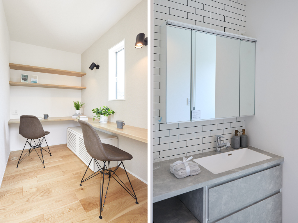 リビングの一角にL型カウンターを造りつけたスタディコーナーをプラス。小さな書斎としてリモートワークなどに活躍します。