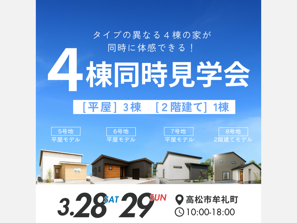 | タイトル | 平屋&2階建てを見比べよう!4棟同時見学会 |