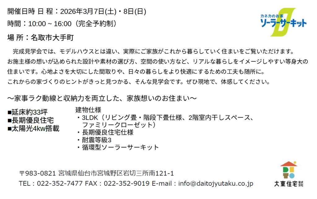 | タイトル | 完成見学会【名取市】OPEN HOUSE |