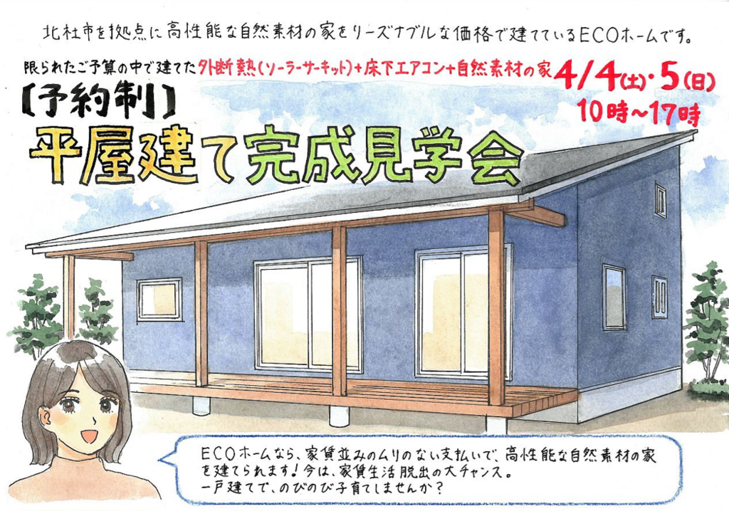 4月4日(土)、5日(日)の週末、北杜市高根町にて、平屋建て完成見学会を開催します!