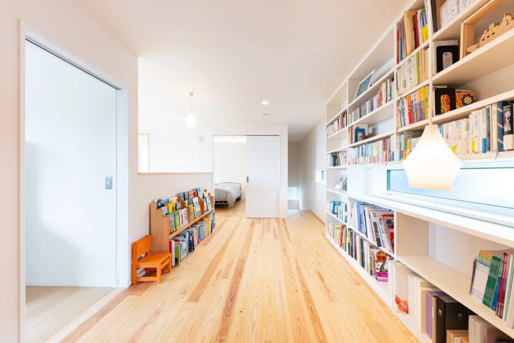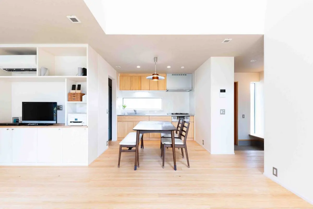 設計を担当したのは、壱弐参(ひふみ)建築設計事務所 市川氏です。コンセプトは「シンプルで無駄を省いた家」。木をたっぷり使うとともに、インテリアは色数を最小限に、余計な家具やインテリアを置かず、エアコンなど生活感のある家電も隠すなど、ミニマルスタイルを徹底。間取りにもその考えが反映されており、吹き抜けのある大空間LDKに、毎日に必要なモノのほとんどを揃えた収納スペース、そしてゆったりとくつろげる洗面脱衣室・浴室で構成された1階は、食事をはじめ、家族団らんやお子さんの勉強、朝・夜の身支度まで、生活のほぼすべてを完結できます。