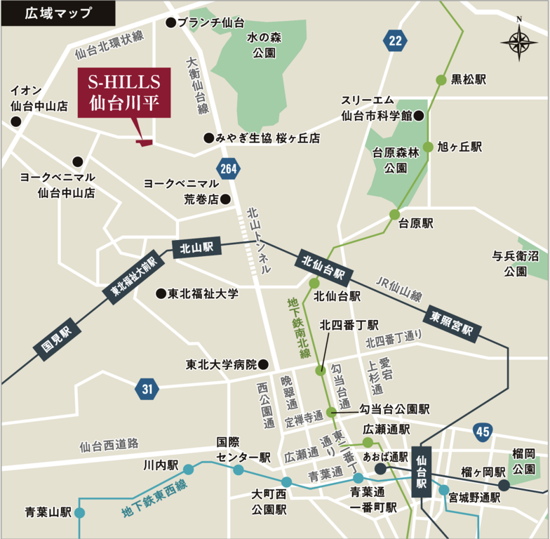 仙台市中心部にほど近い、北環状線内中山入口の閑静かつ利便性の高い立地