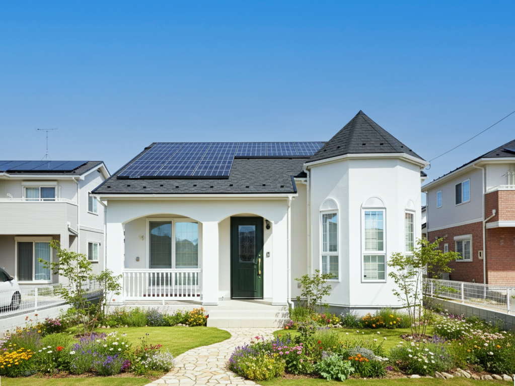 白を基調とした可愛らしい外観に、塔屋とカバードポーチがアクセント。