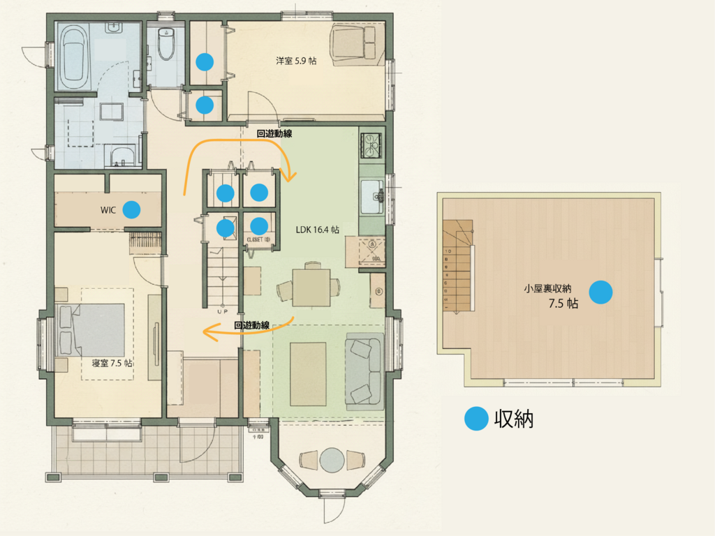 7帖超の屋根裏収納をはじめ、WICや階段下など、暮らしに合わせて使える収納を随所に配置。
